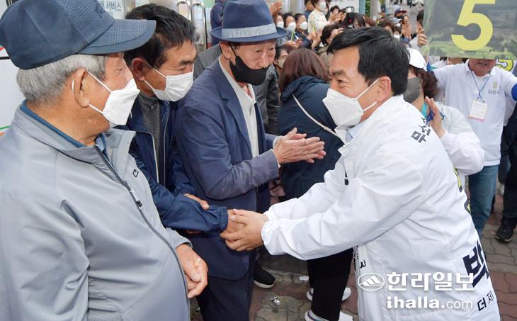 무소속 박찬식 제주도지사 후보가 19일 제주시청 인근 선거사무소에서 열린 출정식에서 지지자들과 인사하고 있다. 이상국기자