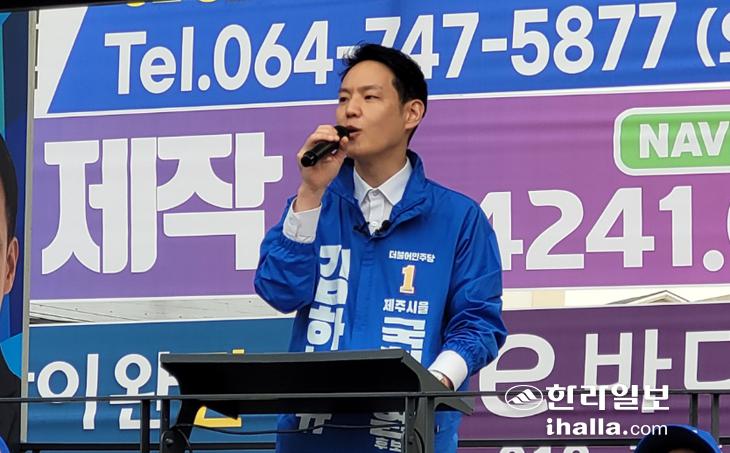 더불어민주당 김한규 제주시을 국회의원 후보가 19일 제주시 구세무서 사거리에서 유세를 하고 있다.