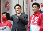 19일 열린 국민의힘 허향진 제주지사 후보 줄정식에서 지원 유세하는 권성동 원내대표. 강희만기자