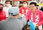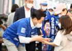 6·1전국동시지방선거 공식선거운동기간 첫 휴일인 22일 민주당 오영훈(사진 왼쪽) 제주도지사 후보와 국민의힘 허향진 후보가 제주시 민속오일시장에서 집중 유세를 전개했다. 강희만기자