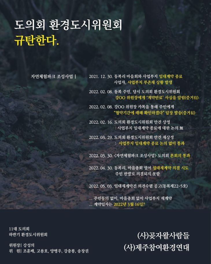 이어 "마을 주민이 해당 내용을 지난 2월 8일 제주도의회 환경도시위원장과 위원들에게 메시지를 보내 알렸고, 위원장을 알았다는 답을 보냈다"며 "이런 문제에도 아랑곳 않고 3월 29일 자연체험파크 조성사업을 통과시켰다"고 덧붙였다.