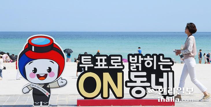 오늘(6월1일)은 지방선거 투표하는 날. 제주시 함덕해수욕장에 설치된 지방선거 홍보물. 이상국기자