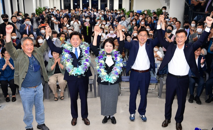더불어민주당 오영훈 제주도지사 후보가 당선이 확정된 직후 부인 박선희 씨 등과 두 팔을 치켜들며 기쁨을 나누고 있다. 강희만기자