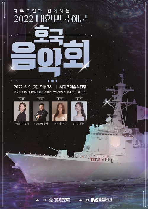 해군7기동전단은 오는 9일 오후 7시 서귀포예술의전당에서 '제주도민과 함께하는 2022 대한민국 해군 호국음악회'를 개최한다고 2일 밝혔다.