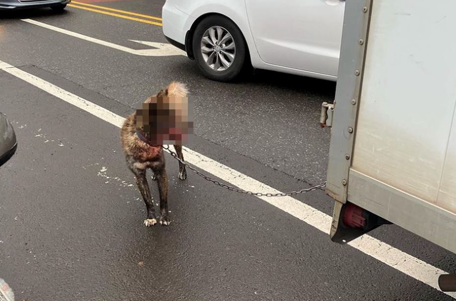 지난 7일 제주시 외도동의 한 도로에서 쇠줄에 묶여 끌려간 개의 모습. SNS캡처