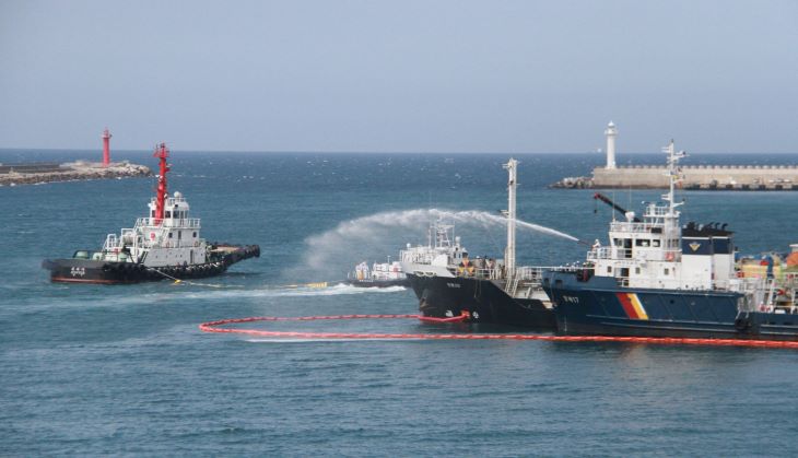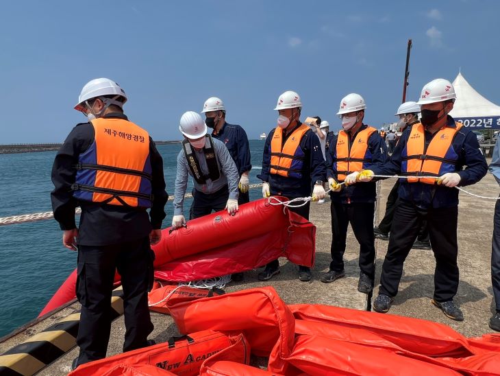 제주해양경찰서는 9일 제주항 4부두에서 유관기관과 함께 해양오염사고 발생을 가정한 민·관 합동 방제 훈련을 실시했다. 제주해양경찰서 제공