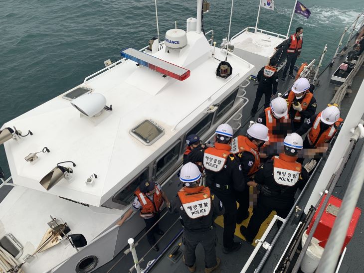 15일 추자도에서 발생한 응급환자를 제주해경 연안구조정과 경비함정이 이송하고 있다. 제주해양경찰서 제공