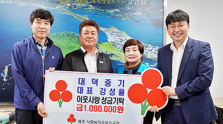 대덕건설중기(대표 강성율)는 지난 15일 서귀포시 성산읍을 방문해 제주사회복지공동모금회를 통해 지역 내 어려운 이웃을 돕는 데 써달라며 성금 100만원을 기탁했다.