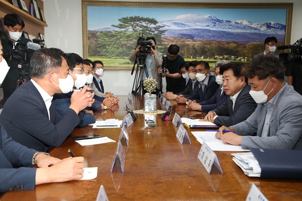 제주도와 제주도의회는 8일 민선8기 제1회 추경안 처리와 전 도민 재난긴급지원금 지원 방안을 논의하기 위한 긴급정책협의회를 열었다.