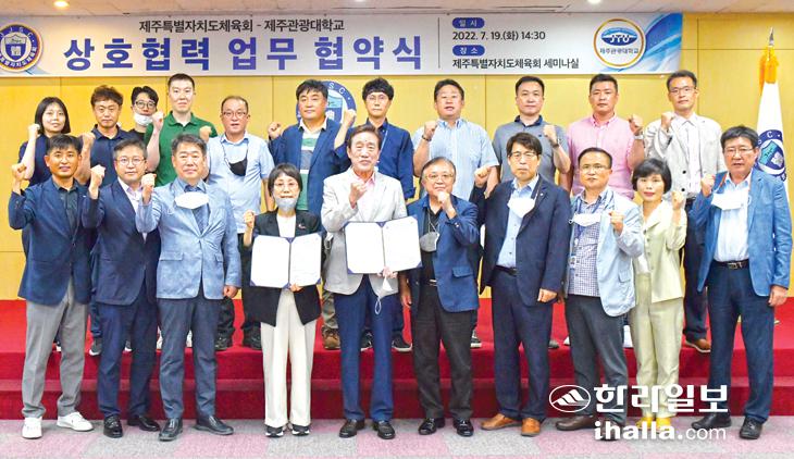 제주특별자치도체육회는 지난 19일 도체육회관 2층 세미나실에서 제주관광대학교와 상호업무 협약식을 가졌다. 주요 협력 분야는 학술교류 및 공동 교육프로그램 운영을 비롯 ▷체육회 주최·주관 행사에 대학관련 학생 참여 협조 ▷선수들의 주기적 체력검사 협조 ▷경기력 향상을 위한 상호 정보교류 및 지원 등이다.