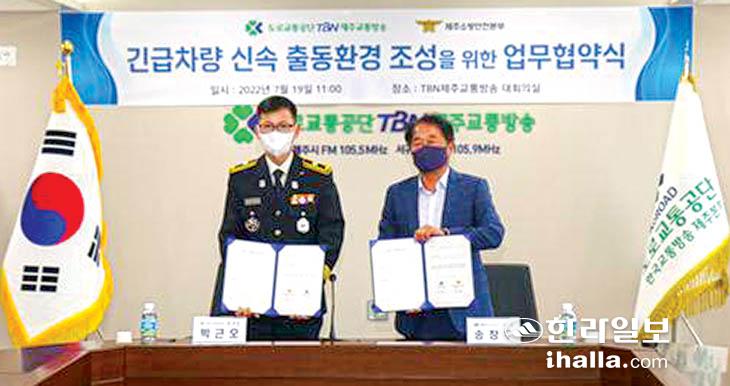 TBN 제주교통방송은 지난 19일 제주소방안전본부와 '긴급차량 신속 출동환경 조성'을 위한 업무협약을 체결했다. 양 기관은 긴급차량 출동 환경 조성에 적극적으로 대응하기로 했다.