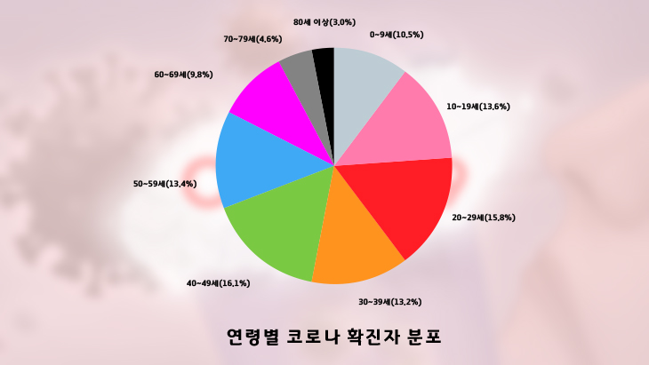연령 별로는 0~9세(10.5%), 10~19세(13.6%), 20~29세(15.8%), 30~39세(13.2%), 40~49세(16.1%), 50~59세(13.4%), 60~69세(9.8%), 70~79세(4.6%), 80세 이상(3.0%) 등의 분포를 보이고 있다.