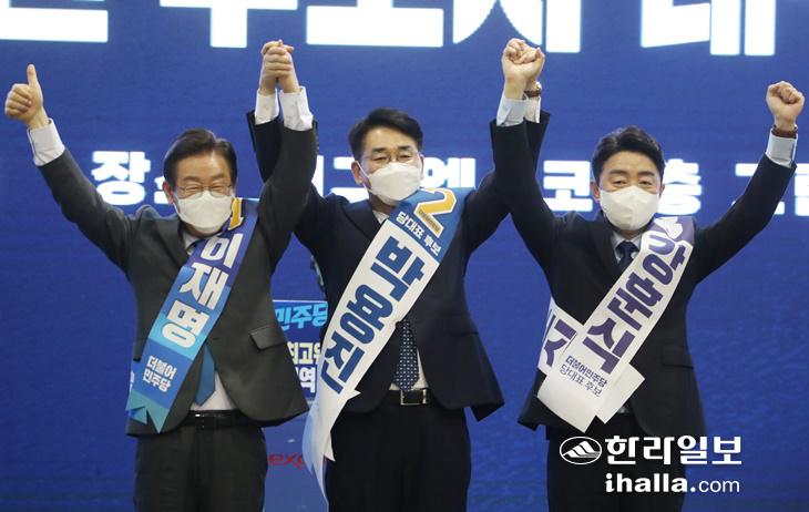 경선 첫날인 6일 합동연설회에서 당원들에게 화답하는 민주당 당 대표 후보들. 이재명(왼쪽부터), 박용진, 강훈식 당 대표 후보. 연합뉴스
