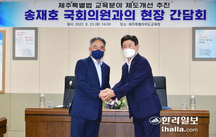 지난 23일 제주도교육청에서 열린 제주특별법 교육분야 제도개선 추진 현장 간담회에서 송재호(왼쪽) 국회의원과 김광수 제주도교육감이 악수를 하고 있다. 사진=제주도교육청