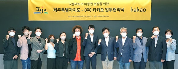 제주도는 7일 경기 성남시 카카오 판교 사옥에서 카카오와 교통약자의 이동권 보장을 위한 업무협약을 체결했다.