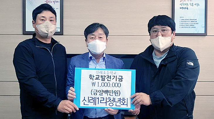 신례초등학교(교장 김희정)는 지난 11일 신례1리 청년회(회장 김한규)로부터 학교발전기금 100만원과 문화상품권 100만원을 전달받았다. 신례1리 청년회는 매년 학교에 발전기금을 기탁하고 있다.
