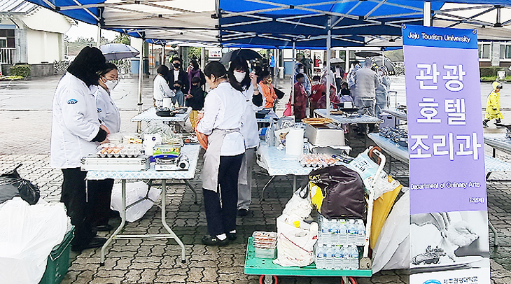 제주관광대학교(총장 김성규) 관광호텔조리과는 지난 8일 제주경마공원에서 열린 마(馬)축제에서 김기쁨 교수와 강재현, 김연지, 정재연, 김소희 학생이 참여해 제주 전통음식 체험 부스를 운영했다.