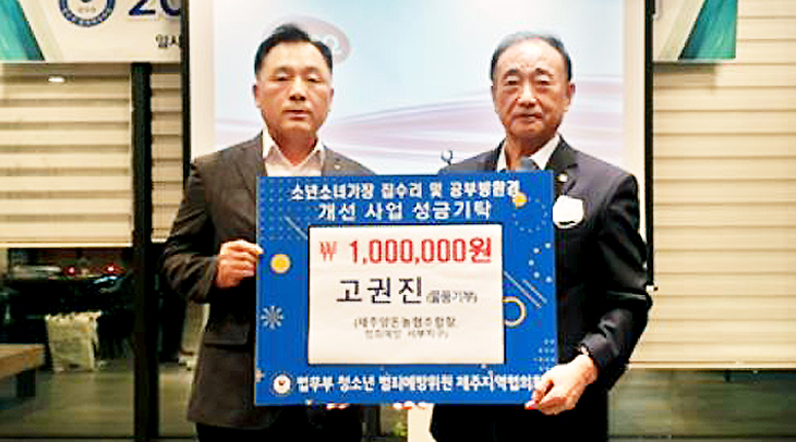 법무부 청소년 범죄예방위원 제주지역협의회(회장 고영두) 고권진(범죄예방분과 서부지구) 위원은 '소년소녀가장 사랑의 집수리 및 공부방 환경 개선사업' 가정에 전달해 달라며 100만원 상당의 돼지고기를 지원했다.