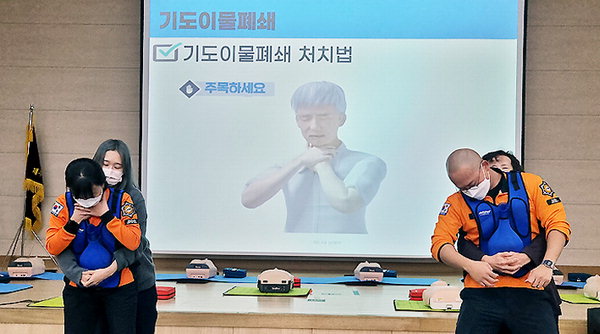 주요 교육내용은 ▷119 신고 방법 ▷응급의료체계 및 응급환자 유형 이해 ▷심폐소생술 및 자동심장충격기(AED) 사용법 ▷기도폐쇄 처치법 ▷구급차(소방차) 길 터주기 홍보 등 응급상황에서 구급대 도착 전 다양한 초기 응급처치 방법을 체험했다.