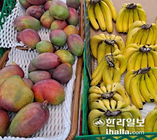 고소득작물에 대한 농가 관심이 높아지고 기후변화가 빨라지면서 제주에서도 아열대과수 재배가 늘어 도내 농협하나로마트에서 바나나와 망고가 판매되고 있다. 문미숙기자