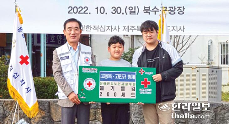 제주제일고등학교 고동욱, 신제주초등학교 고민규 형제는 지난달 30일 북수구광장에서 대한적십자사제주특별자치도지사(회장 오홍식)에 노인시설과 장애인시설을 지원하기 위해 110만원 상당의 들기름김 200세트를 기탁했다.