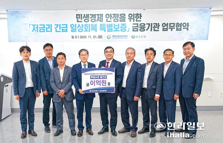제주은행(은행장 박우혁)과 제주신용보증재단(이사장 김광서)은 1일 재단 회의실에서 지역경제 활성화 업무협약을 체결했다. 이번 협약을 통해 제주은행은 금리 인상 등으로 자금난을 겪고 있는 도내 중소기업, 소기업, 소상공인에게 특례보증 공급을 위한 특별출연금 2억원을 제주신용보증재단에 출연하고, 재단은 이를 바탕으로 보증한도 30억원까지 특례보증서를 발급하게 된다.
