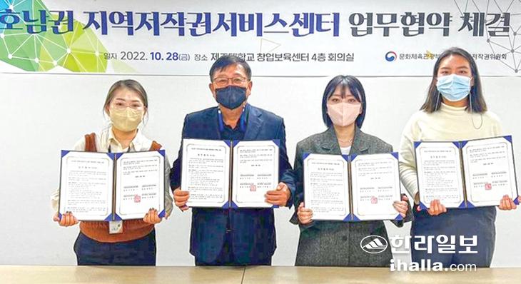 제주대학교창업보육센터(센터장 이동철) 제주저작권서비스센터와 (재)광주정보문화산업진흥원(원장 탁용석), 전남정보문화산업진흥원(원장 이인용), 전주정보문화산업진흥원(원장 이영로)은 지난달 28일 제주대 창업보육센터에서 각 기관별 운영하고 있는 지역저작권서비스센터의 상호 교류 협력을 위한 업무협약을 체결했다. 전국 15개 저작권서비스센터 중 2번째로 이뤄지는 권역별 저작권서비스센터 협의체다.