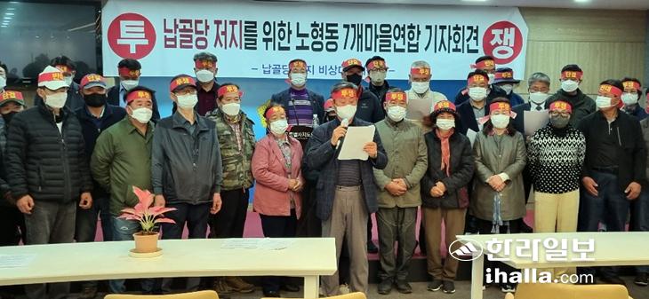 '신비마을 납골당 건립 반대를 위한 7개 마을연합 일동'은 18일 제주도의회 도민카페에서 기자회견을 하고 있다. 이상민 기자