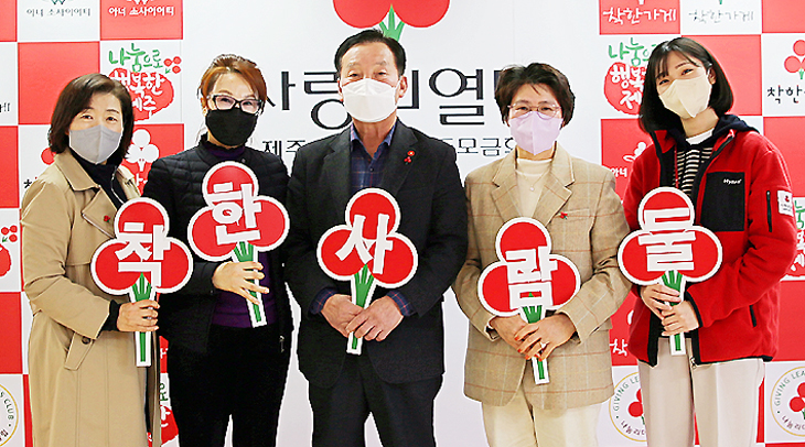제주제일고 부설 방송통신고 46기 학생들이 제주 사랑의열매에 성금을 전달하고 기념촬영을 하고 있다. 제주사랑의열매 제공