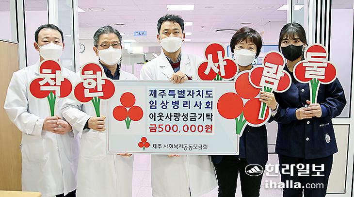 제주특별자치도 임상병리사회 관계자들이 지난 12일 이웃 돕기 성금을 기탁하고 기념촬영을 하고 있다. 제주사랑의열매 제공