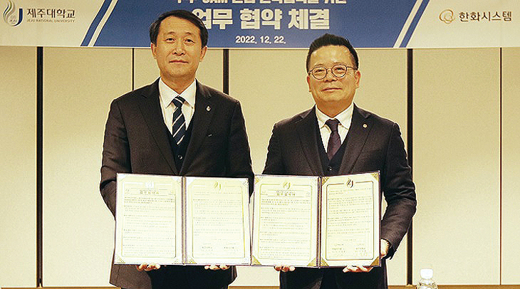 한화시스템(대표이사 어성철)과 제주대학교(총장 김일환)는 지난 22일 제주대학교에서 '우주·UAM 분야 공동 연구개발 협력 및 제주지역 전문인재 양성'을 위한 양해각서(MOU)를 체결했다.