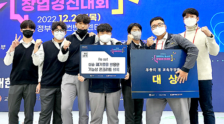 한림공업고등학교(교장 오창섭) 창업 동아리 리셋팀(2학년 고효범, 박이레, 강원준)이 지난 22일 세종시 정부청사 컨벤션센터에서 실시된 2022 대한민국 청소년 창업경진대회에서 대상을 수상했다. 리셋팀은 실습폐기물을 업사이클링해 만든 '기능성 콘크리트블록' 사업 아이템을 발표해 좋은 평가를 받았다.