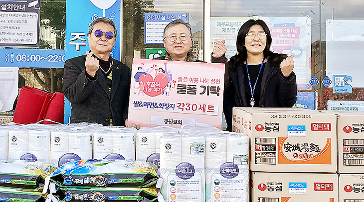 제주동산교회(담임목사 김경태)는 지난 4일 관내 어려운 이웃을 위해 쌀·라면·화장지 30세트를 구입해 오라동(동장 오수원)에 기탁했다.
