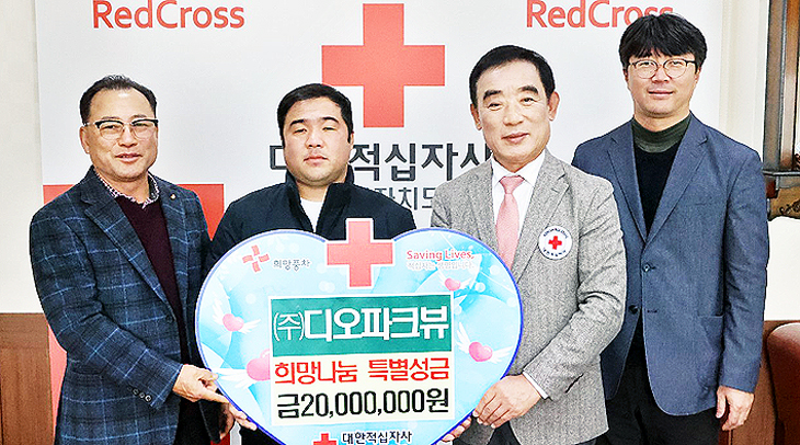 (주)디오파크뷰(대표 강용권·강승연)는 지난 6일 대한적십자사제주특별자치도지사(회장 오홍식)를 방문해 지역사회 소외된 이웃을 돕는 데 써달라며 희망나눔 특별성금 2000만원을 전달했다. 이번 성금은 어려운 이웃을 돕기 위해 마련됐으며 위기가정 긴급지원, 희망풍차 결연 등에 사용될 예정이다.