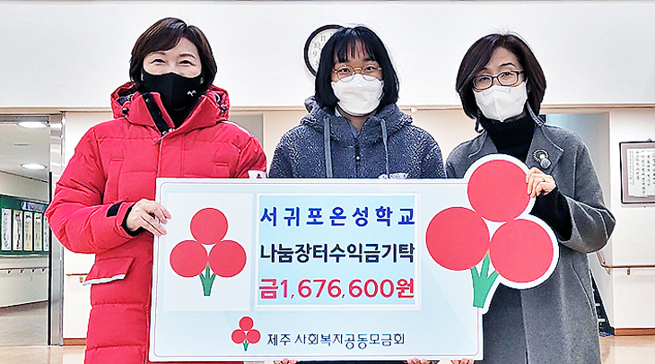 서귀포온성학교(교장 김빛나)는 최근 학교 강당에서 이웃들을 위해 사용해 달라며 성금 167만6600원을 제주사회복지공동모금회(회장 강지언)에 기탁했다. 이번 성금은 지난해 12월 21일 서귀포온성학교에서 운영한 나눔 장터를 통해 마련했으며 도내 복지사각지대 발굴과 해소에 사용될 예정이다.