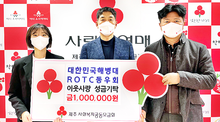 해병대ROTC동우회(회장 문성윤)는 최근 제주사회복지공동모금회(회장 강지언) 사무실에서 이웃사랑 성금 100만원을 기탁했다. 이날 성금은 회원들의 회비를 십시일반 모아 마련한 것으로 도내 어려운 이웃들의 생계비·의료비 등으로 전달될 예정이다.