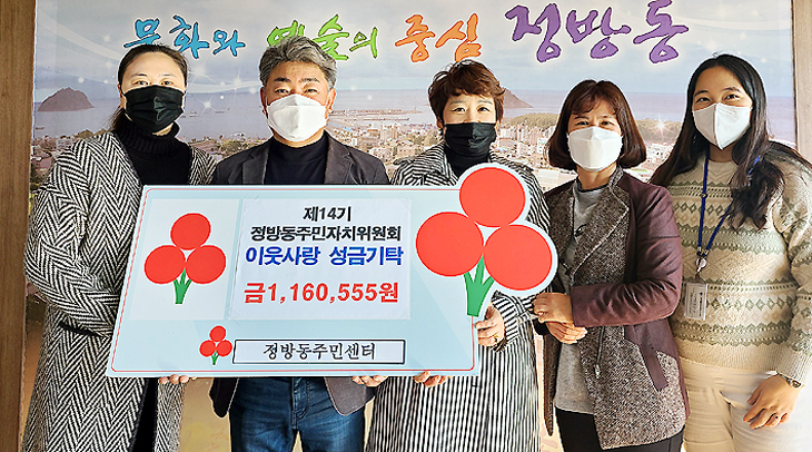 정방동주민자치위원회(위원장 한동철)는 지난 4일 정방동주민센터를 방문해 지역 내 어려운 이웃의 의료비 지원을 위한 이웃사랑 성금 116만555원을 기탁했다. 이번 성금은 정방동 내 어려운 이웃들의 의료비로 전달될 예정이다.