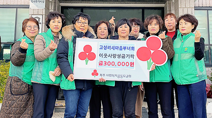 고성리새마을부녀회(회장 조미경)는 최근 고성리사무소에서 회원들이 십시일반 마련한 성금 30만원을 제주사회복지공동모금회(회장 강지언)에 기탁했다. 이번 성금은 지역사회 복지 인프라 증진 사업으로 사용될 예정이다.