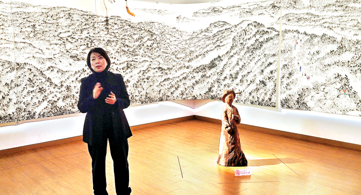 지난 13일 진행된 도내 문화부 기자 대상 제3회 제주비엔날레 현장 답사에서 박남희 예술감독이 제주현대미술관에 전시된 황수연 작가의 작품을 설명하고 있다.