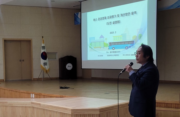 제주도가 '버스 준공영제 성과평가 및 개선방안 용역'에 대한 도민 설명회를 17일 개최한 가운데 용역진이 관련 내용을 설명하고 있다. 강다혜기자