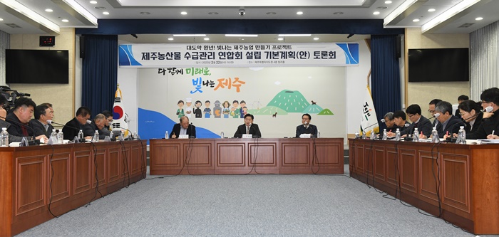 제주특별자치도는 22일 제주도청 4층 탐라홀에서 제주 농산물 수급관리연합회 설립 기본계획(안)을 공개하고 농업관련 기관·단체의 의견 수렴을 위한 토론회를 개최했다. 이상국기자