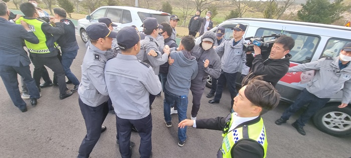 3일 제주4·3 평화공원에서 집회를 시도한 서북청년단의 차량을 시민단체 등이 막아서자 경찰이 격리조치하고 있다. 제주도사진기자회