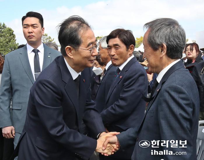 한덕수 국무총리가 3일 열린 제75주년 제주4·3희생자 추념식에서 김태환 전제주지사와 악수를 나누고 있다. 제주도사진기자회