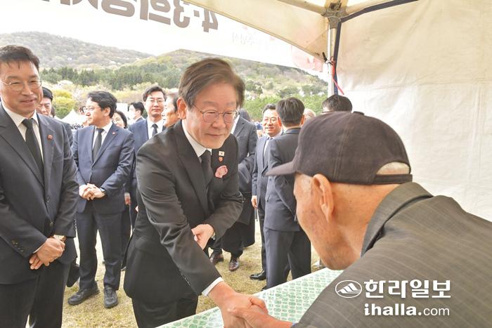 이재명 더불어민주당 대표가 3일 열린 제75주년 제주4·3희생자 추념식에서 유족과 악수를 나누고 있다. 제주도사진기자회