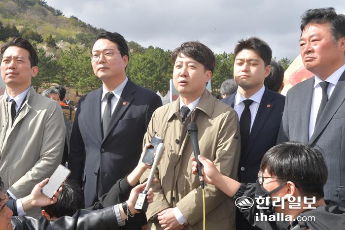 이준석 전국민의힘 대표가 3일 열린 제75주년 제주4·3희생자 추념식에서 인터뷰를 진행하고 있다. 제주도사진기자회