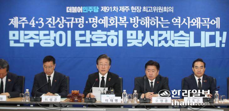 이재명 대표는 모두발언을 통해 "정부·여당의 극우적인 행태가 4·3 정신을 모독하고 있다"며 "4·3은 김일성의 지시로 촉발됐다는 망언을 한 여당 지도부는 아직 사과 한마디 하지 않고 있고, 공산세력에 의한 폭동이라고 폄훼한 인사는 아직도 진실화해위원장 자리를 지키고 있다"고 비판했다.