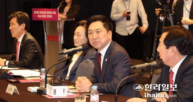 제75주년 제주4·3희생자 추념식이 열린 3일 오후 김기현 국민의힘 대표가 서울 여의도 중기중앙회에서 열린 중소기업중앙회 초청 간담회에서 발언하고 있다. 연합뉴스