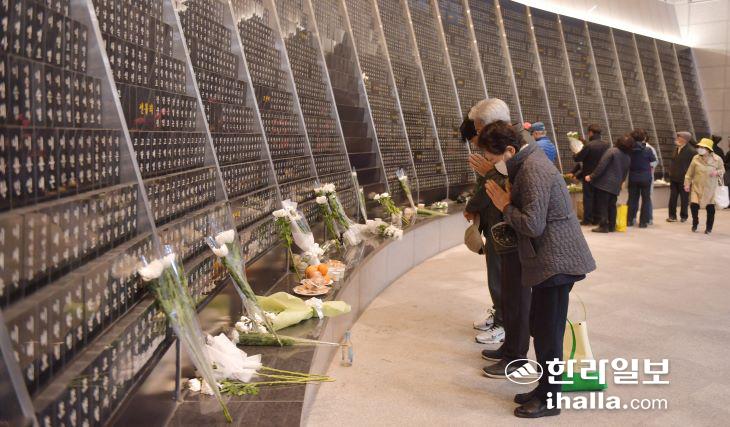 3일 제주4·3 평화공원을 찾은 유족들이 위패봉안실에서 희생자들을 추모하고 있다. 제주도사진기자회