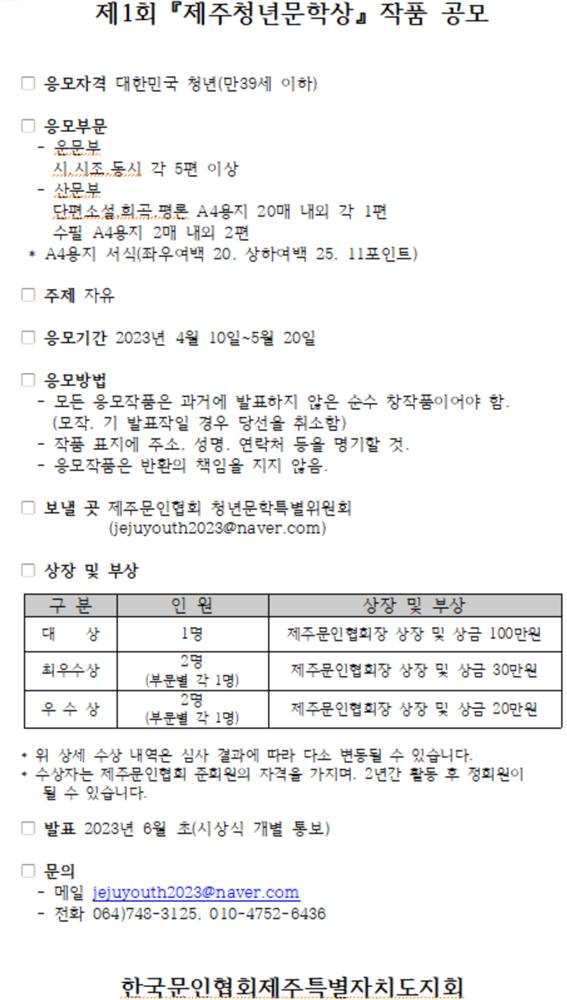 응모기간은 오는 10일부터 5월 20일까지로, 제주문인협회 청년문학특별위원회(jejuyouth2023@naver.com)로 보내면 된다.