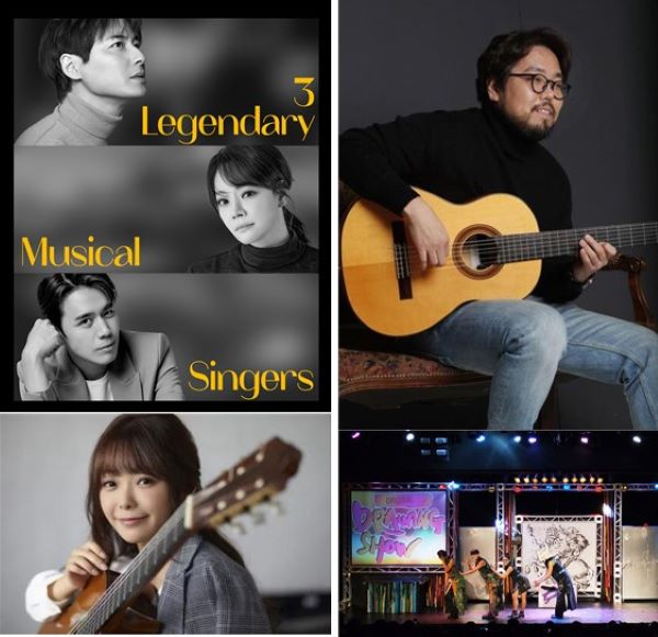 사진 왼쪽부터 시계방향으로 '3Legendary Musical Singers'(뮤지컬배우 이지훈, 김소현, 손준호), 기타리스트 박주원, 오리지널 드로잉쇼, 기타리스트 박규희. 제주아트센터 제공